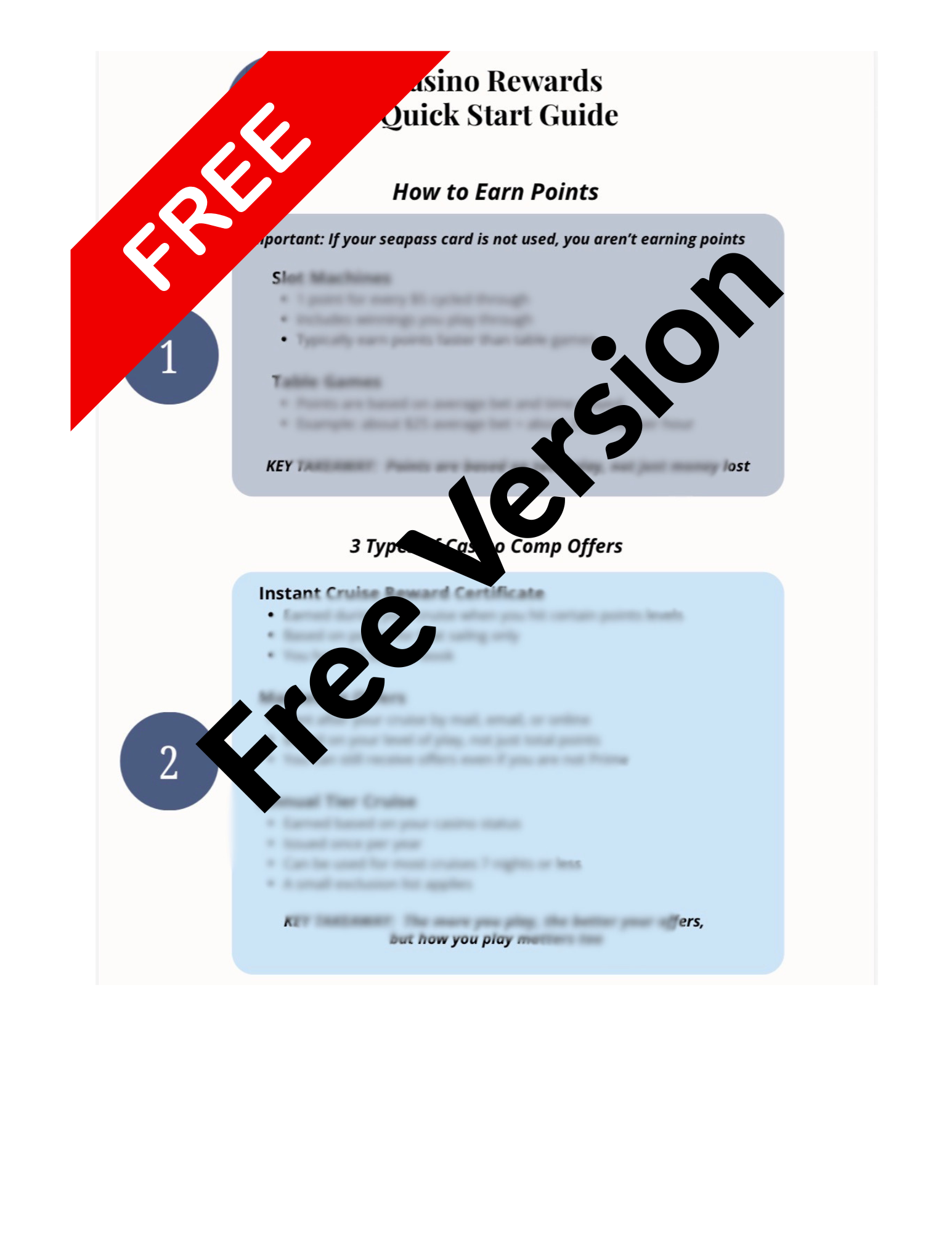 Your quick reference starter guide to earning free cruises with Casino Royale on Royal Caribbean. The guide includes sections on earning points, types of casino comp offers and Club Royale status levels/perks. It's optimized for mobile viewing so that you can keep it on your phone for easy reference on your cruise!